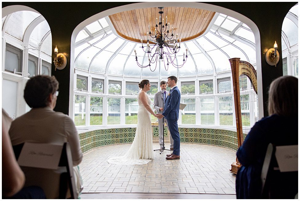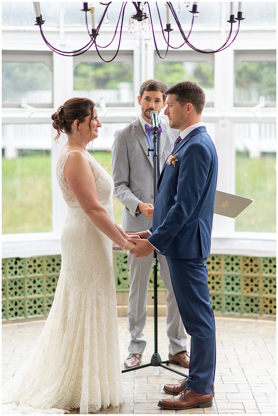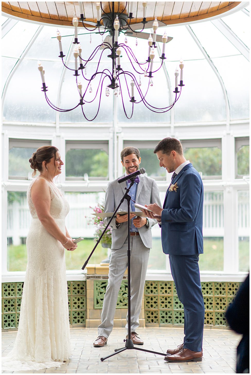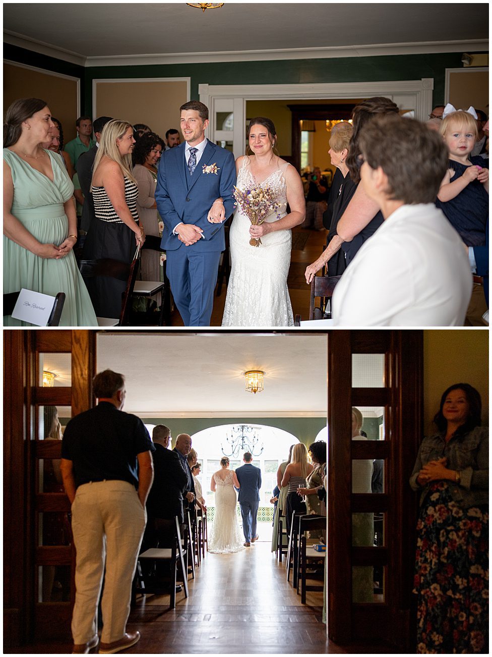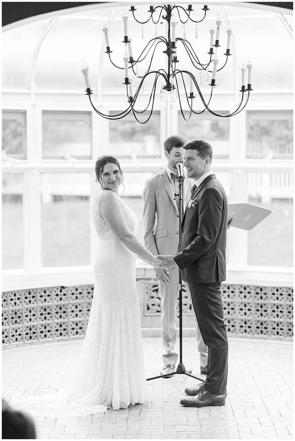 Jeremy and Anna had such a beautiful and unique wedding at a historic mansion. The ceremony and reception were held inside the atrium, which was such a stunning backdrop for their celebration. Instead of dancing, they planned something that fit them perfectly—lawn games! Their custom cornhole boards with their dogs’ faces on them were such a fun touch and had everyone smiling.